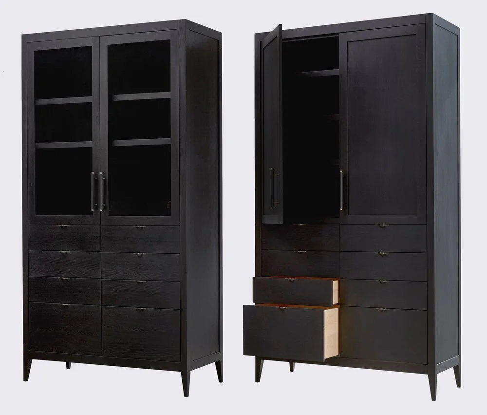 Crafted with meticulous attention to detail, the Crane cabinet is available with either glass or solid panel doors, allowing you to tailor its aesthetic to your needs. Each cabinet includes two adjustable shelves, dovetail drawers, and locally made oxidized brass and black leather handles and oxidized brass pulls.