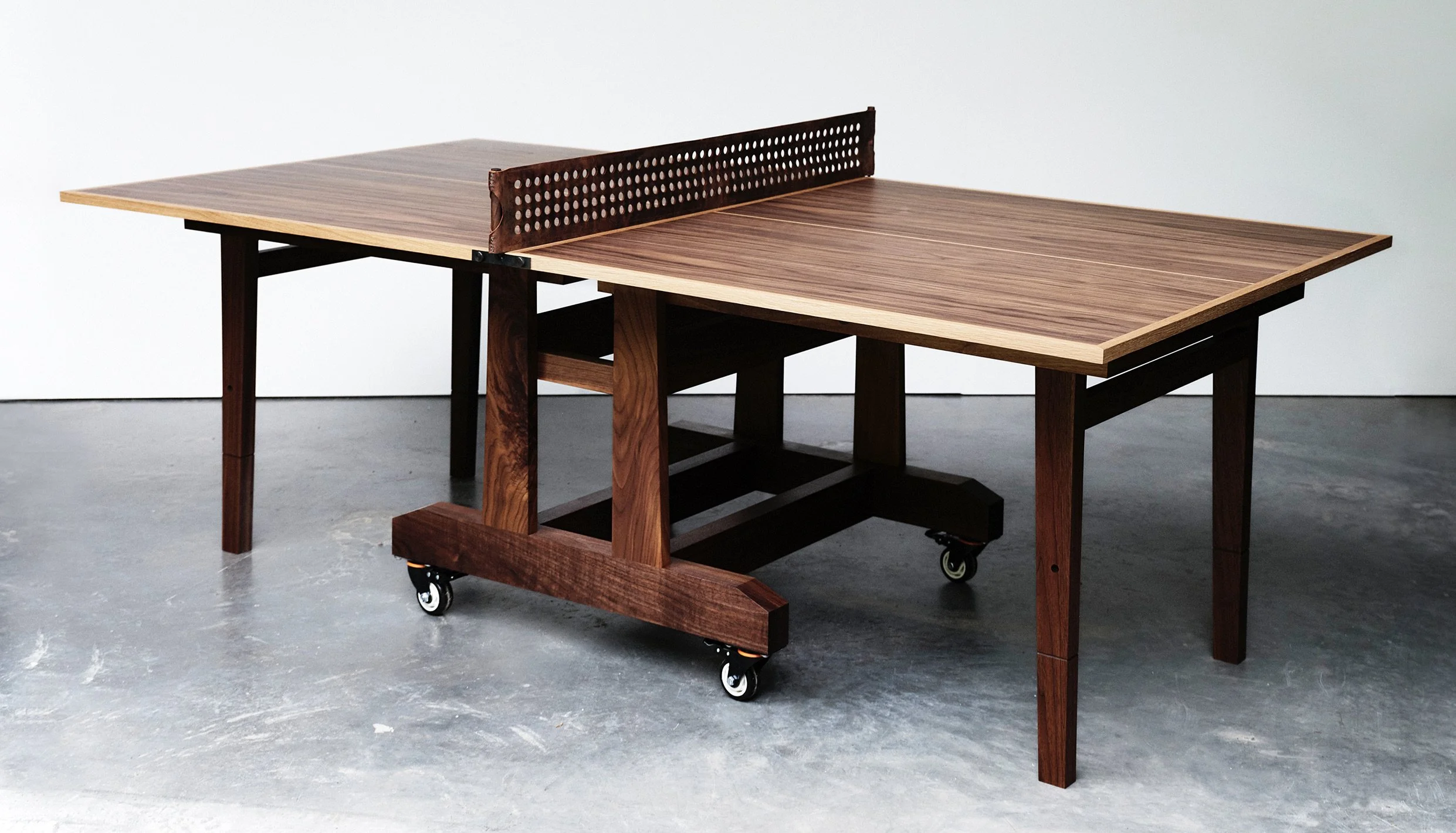 This custom ping pong table was designed with versatility and elegance in mind. Crafted primarily from walnut with a veneered walnut top, it effortlessly transitions between a functional game table and a sophisticated occasional table for entertaining. The foldable design allows it to be easily wheeled out of the way when not in use, while the removable net—custom-made by Ashira in collaboration with Flux Productions in Brooklyn—adds a personal and artisanal touch. Both practical and beautiful, this table is a testament to thoughtful design and collaborative craftsmanship.