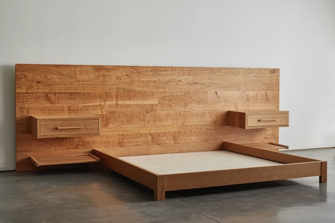 The Suffolk Bed was a collaboration with JAGR Projects for the design and New York Heartwoods for the lumber, sourced from the client’s own wild cherry tree. This stunning piece features built-in nightstands, custom floating trays, and uniquely hand-sculpted pulls, combining functionality with artistry. Its minimalist design highlights the natural beauty of the wild cherry wood, showcasing its rich grain and striking figure. The result is a truly one-of-a-kind bed that embodies thoughtful craftsmanship and timeless elegance.